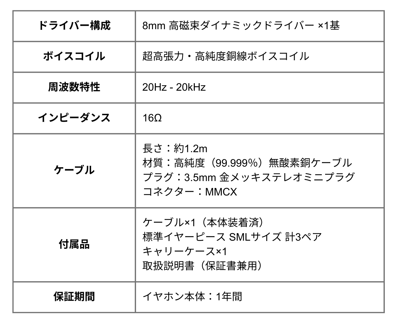 1. イヤホン本体の保証は1年間です。ケーブルやキャリングケースは初期不良のみ対応となります。修理の申し込みは保証書内の連絡先までお願い致します。